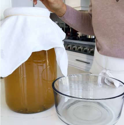 If you don’t have a scoby, you can grow your own using a store-bought kombucha. Buy a plain kombucha (sometimes called “original”). Pour 2 cups or 500ml inside a round glass container and cover with a cloth secured with an elastic band. Leave it on the counter at room temperature for 2-3 or 4 weeks depending on the temperature of your kitchen. You will see it grow every week, so when you see it’s 1cm thick (approx. 1/2 inc) it’s ready to go.