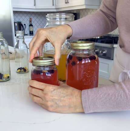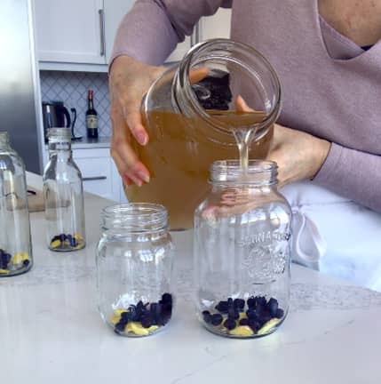 Pour the fermented kombucha into the bottles with the fruit and make sure you close tight the lids. Place them in a dark place at room temperature (inside one of your cupboards) and let ferment for at least another 3 days after that they can be stored in the fridge.