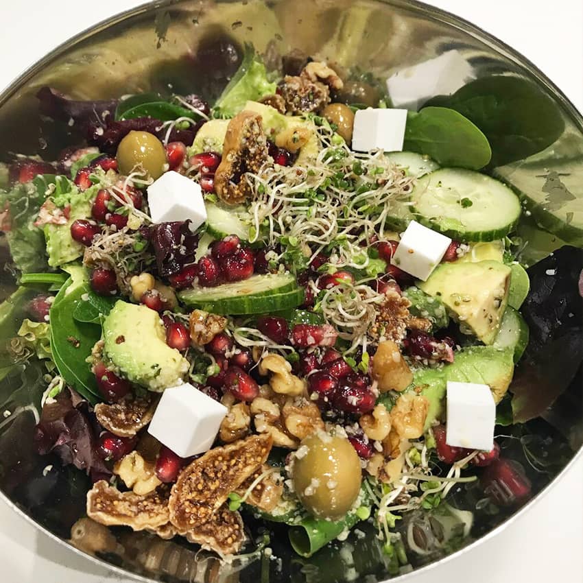 Then you add healthy fats like avocado, olives, nuts and seeds also packed with proteins. You can also choose some dry fruits (no sugar added) figs and cranberries.
